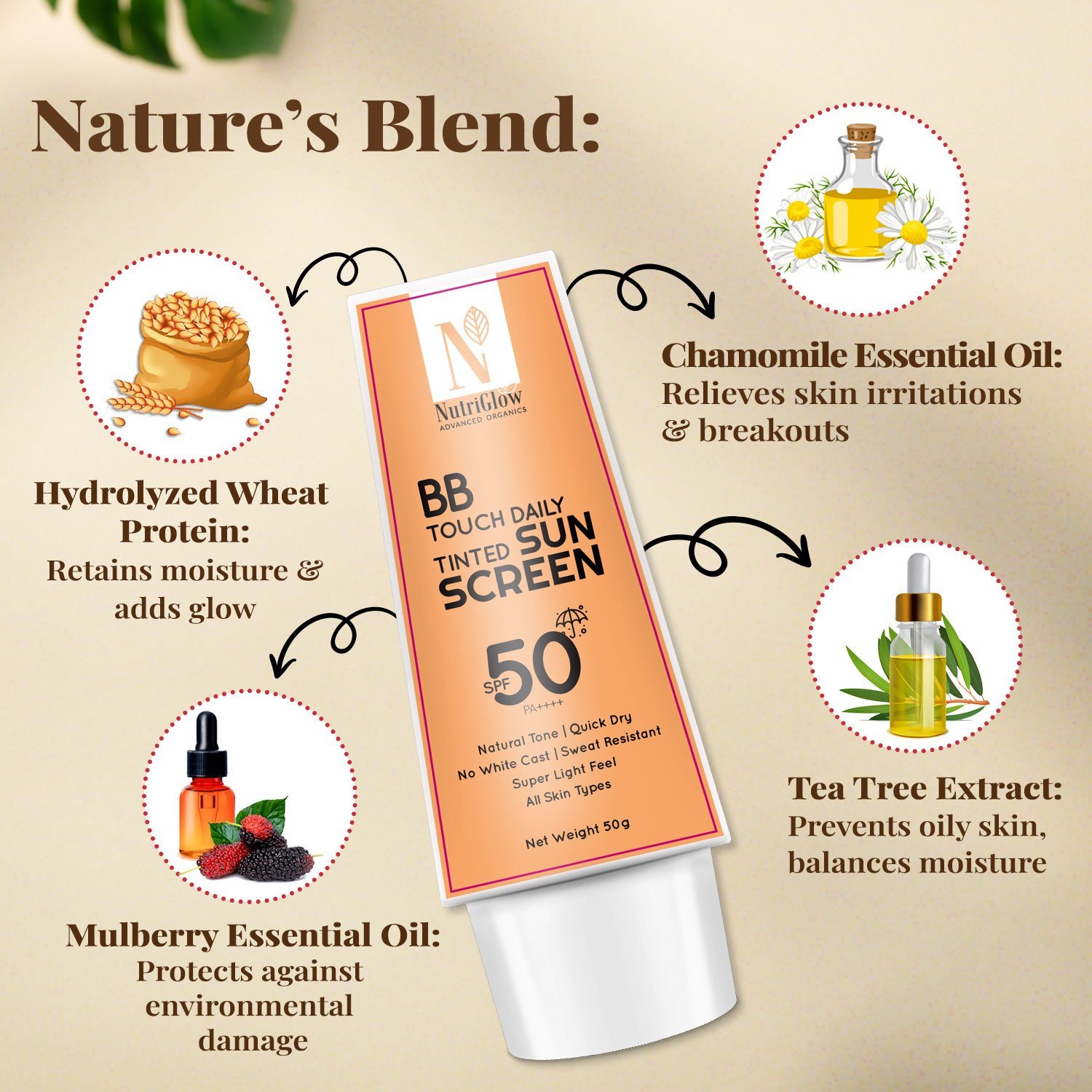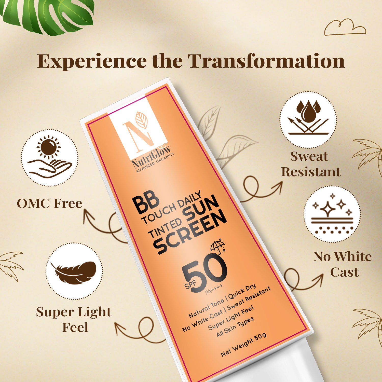 - MAXIMUM PROTECTION AGAINST SUN: The NutriGlow BB Touch Daily Tinted Sunscreen SPF50 with a rating of PA ++++ is considered to provide ultimate protection against harmful UVA & UVB rays. It blends with your skin in no time and enhances the overall look.